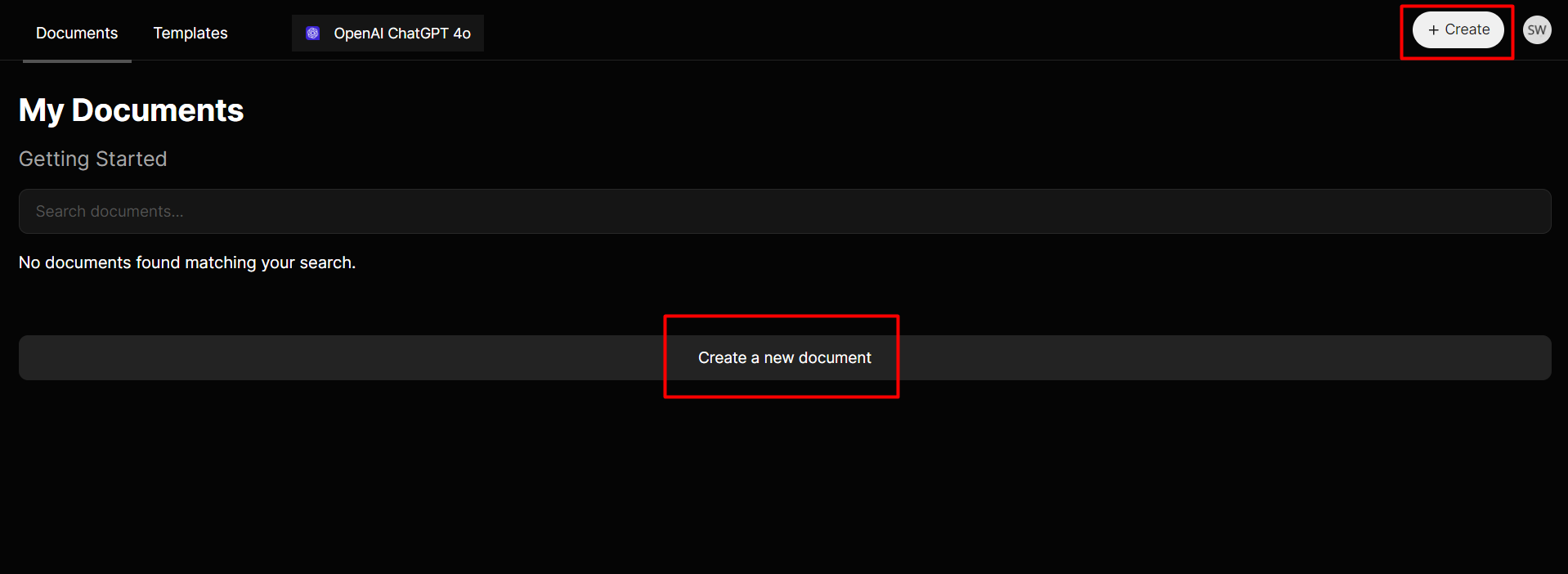 - Click the “+Create” or “Create a new document” button to open a blank document.